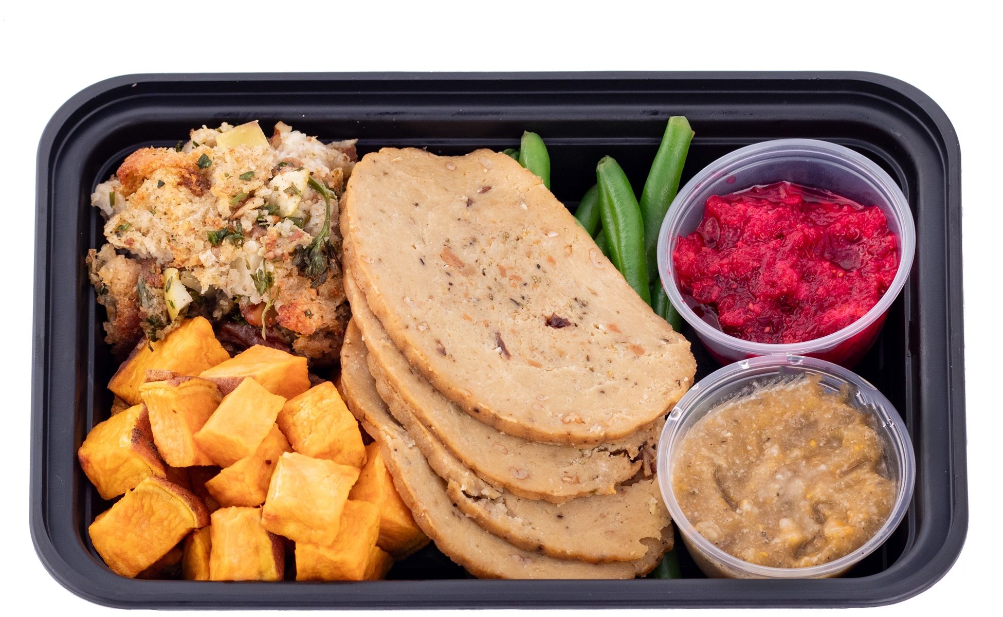 The vegan holiday meal includes a single serving of a Field Roast Sage and Garlic Celebration Roast, apple pecan stuffing, roasted sweet potatoes, green beans, roasted vegetable gravy, and fresh cranberry relish. Your vegan guest will appreciate your thoughtfulness!